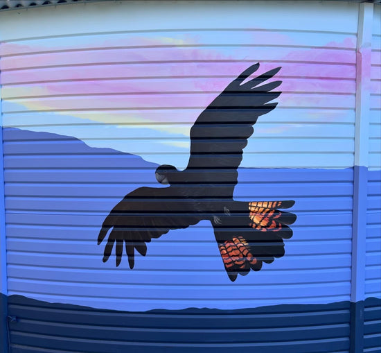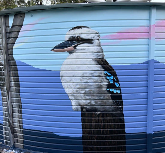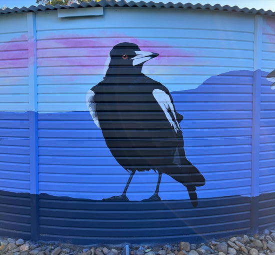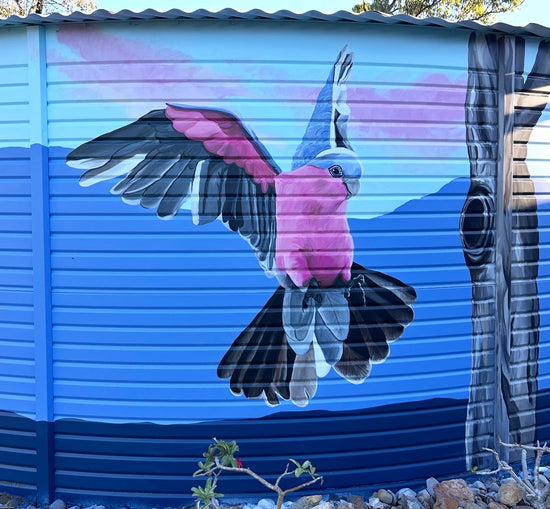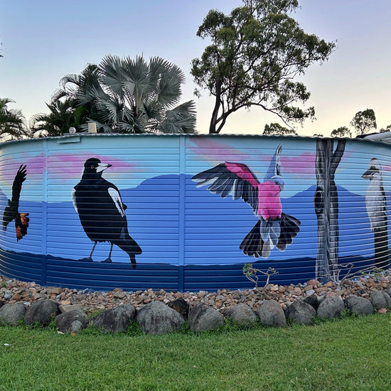 Completed April 2024, this stunning artwork transformed a large water tank that sat at the entry way to a rural home. This mural was inspired by the local birds found around the property.