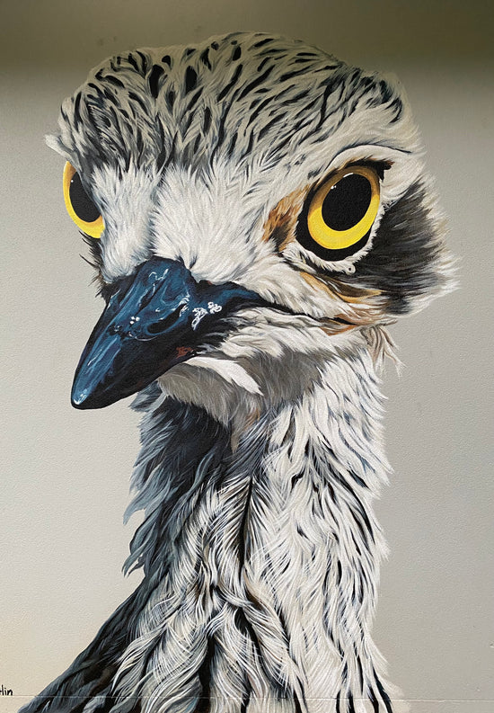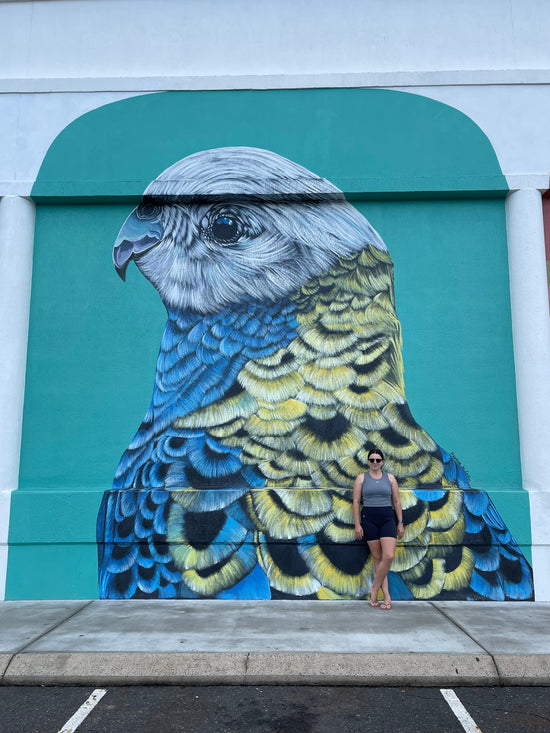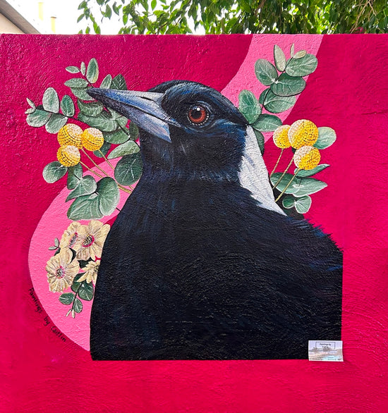 In 2023, Caitlin was chosen to be part of a team of 4 artists to complete a mural along the exterior wall of Stocklands, facing the cinemas. This is one of her two panels, featuring a pale-headed rosella.