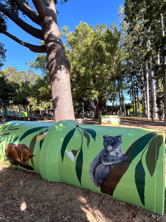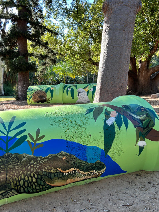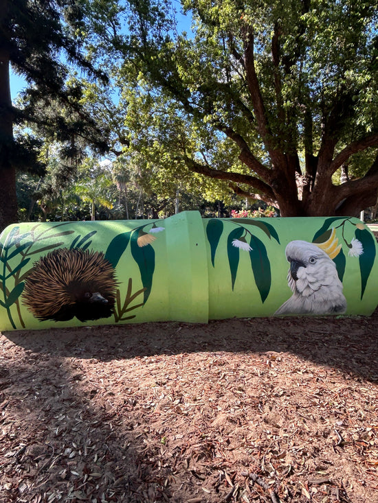 You’ll find two pipes hand painted with wildlife found at the zoo nearby the playground at the Botanic Gardens in Rockhampton. These pipes have been here for over 50 years and were in need of a makeover!