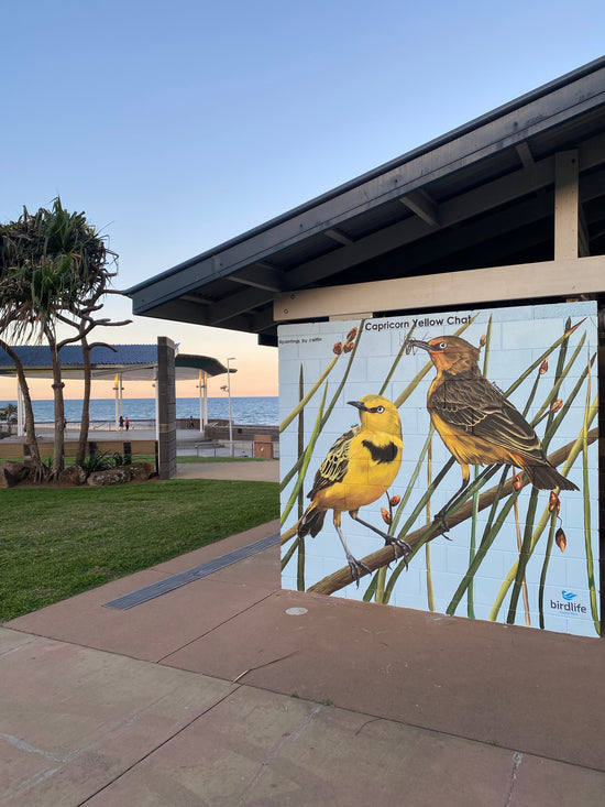 Caitlin’s second mural was commissioned by Bird Life Capricorn to bring awareness to endangered native birds from the region. This mural features Yellow Chats. This mural can be seen at Yeppoon on the Main Beach, opposite Lure Living.
