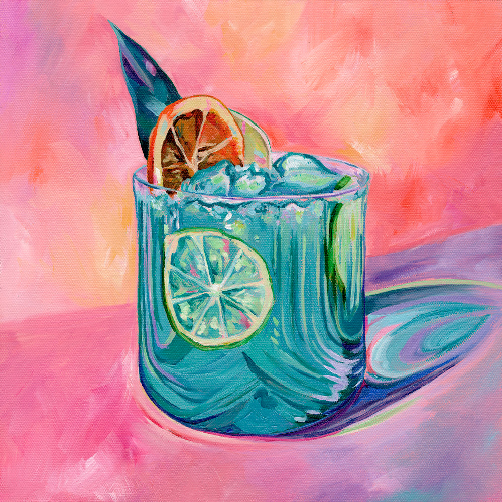 Tequila, Cointreau, pineapple juice, lemon, jalapeno. This one has some punch to it! Bold strokes, vivacious colours and scrumptious textures, this mini cocktail piece is a true statement. Perfect for that shelf, hall table, kitchen cupboard or awkward space that is in need of some brightening up.