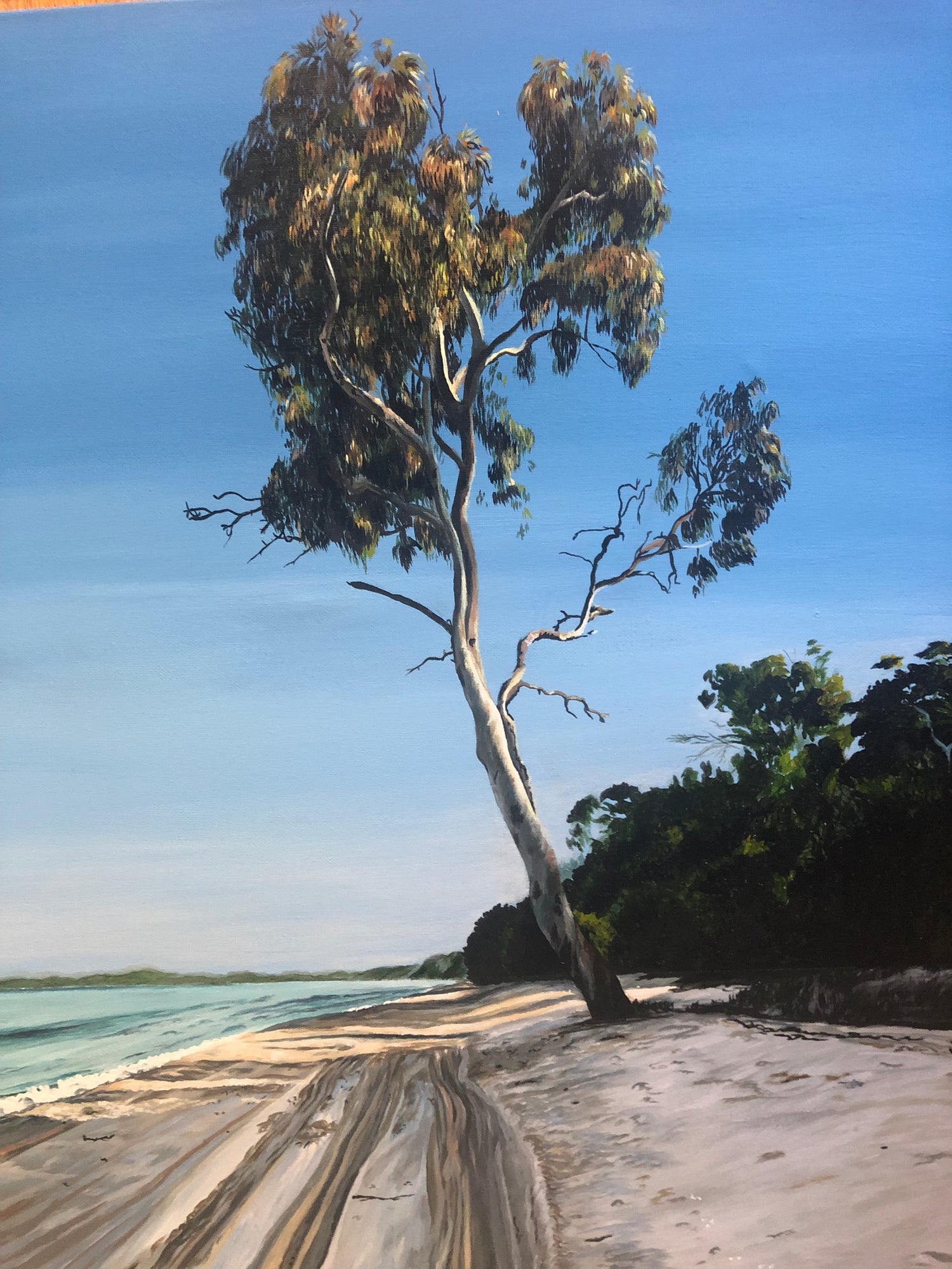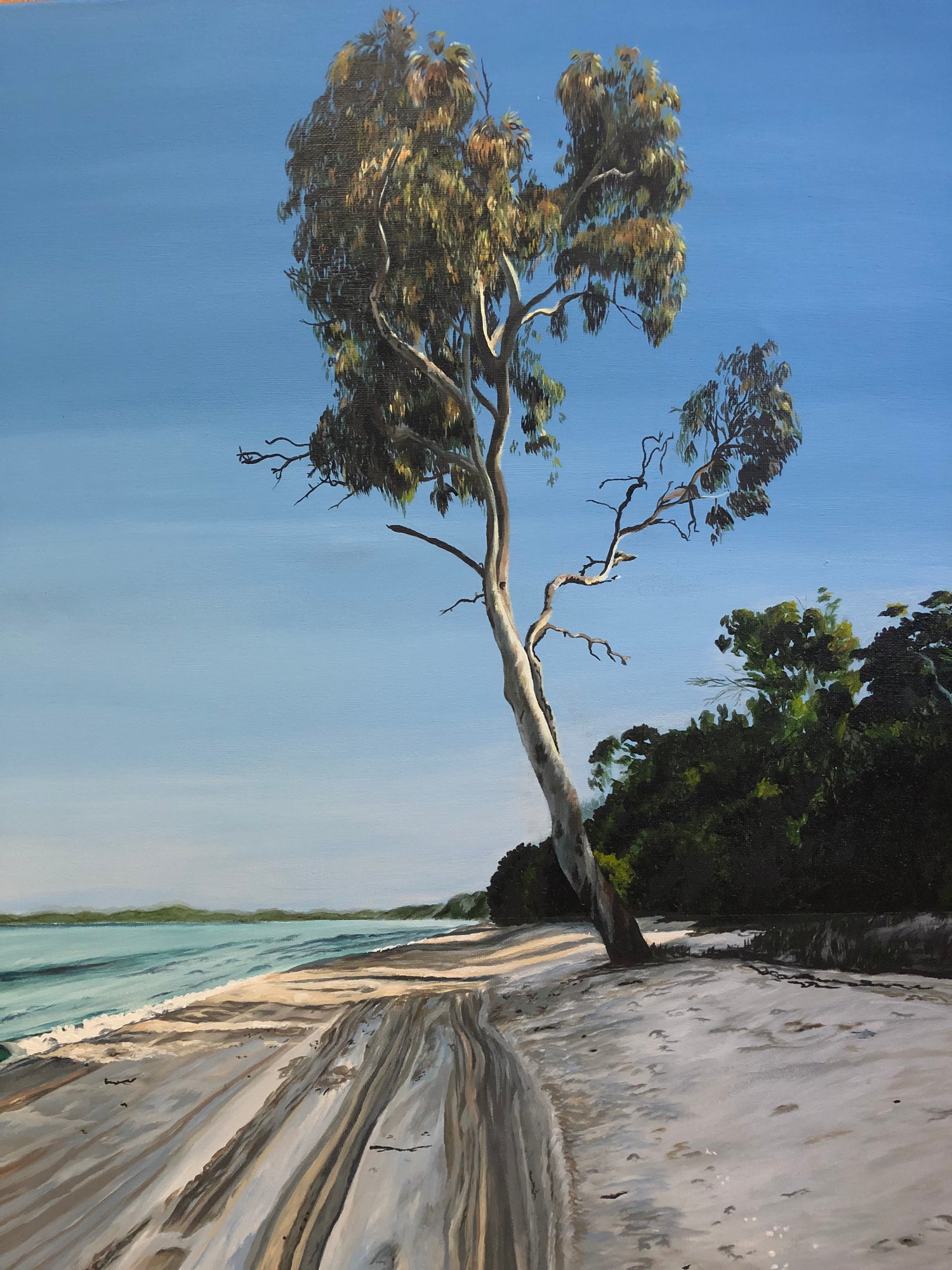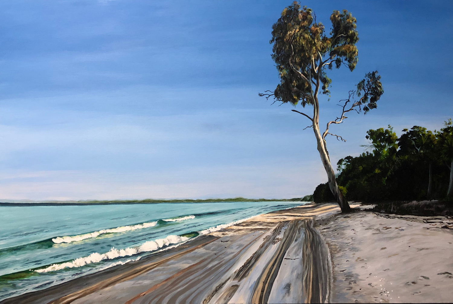 With sand banks that stretch over 120km, vast dunes and deserted beaches, it's hard not to feel at peace as you enjoy a drive along the coast line of K'gari (Fraser Island). Travelling down the western coast lies one tree that stands out from the rest. It has planted its roots on the high tide line, growing tall and strong above the cascading waves and fading tire tracks of passerbyers. The simplicity and serenity of this scene is what inspired this painting. I wanted to capture the perspective of the sand banks with the tire tracks fading into the distance. People come and go and enjoy what Fraser Island has to offer, but everyday the morning sun will kiss the branches of this big, old tree.Acrylic on canvas
