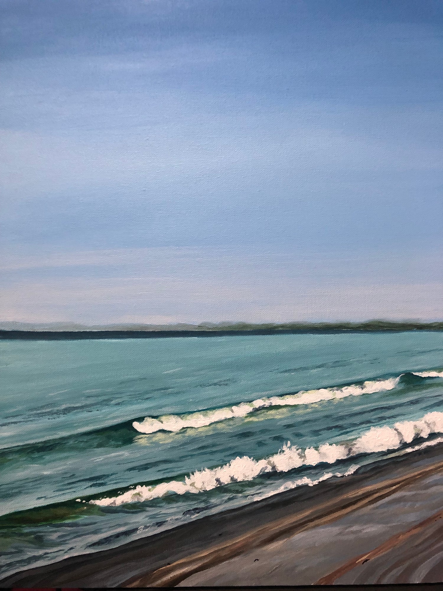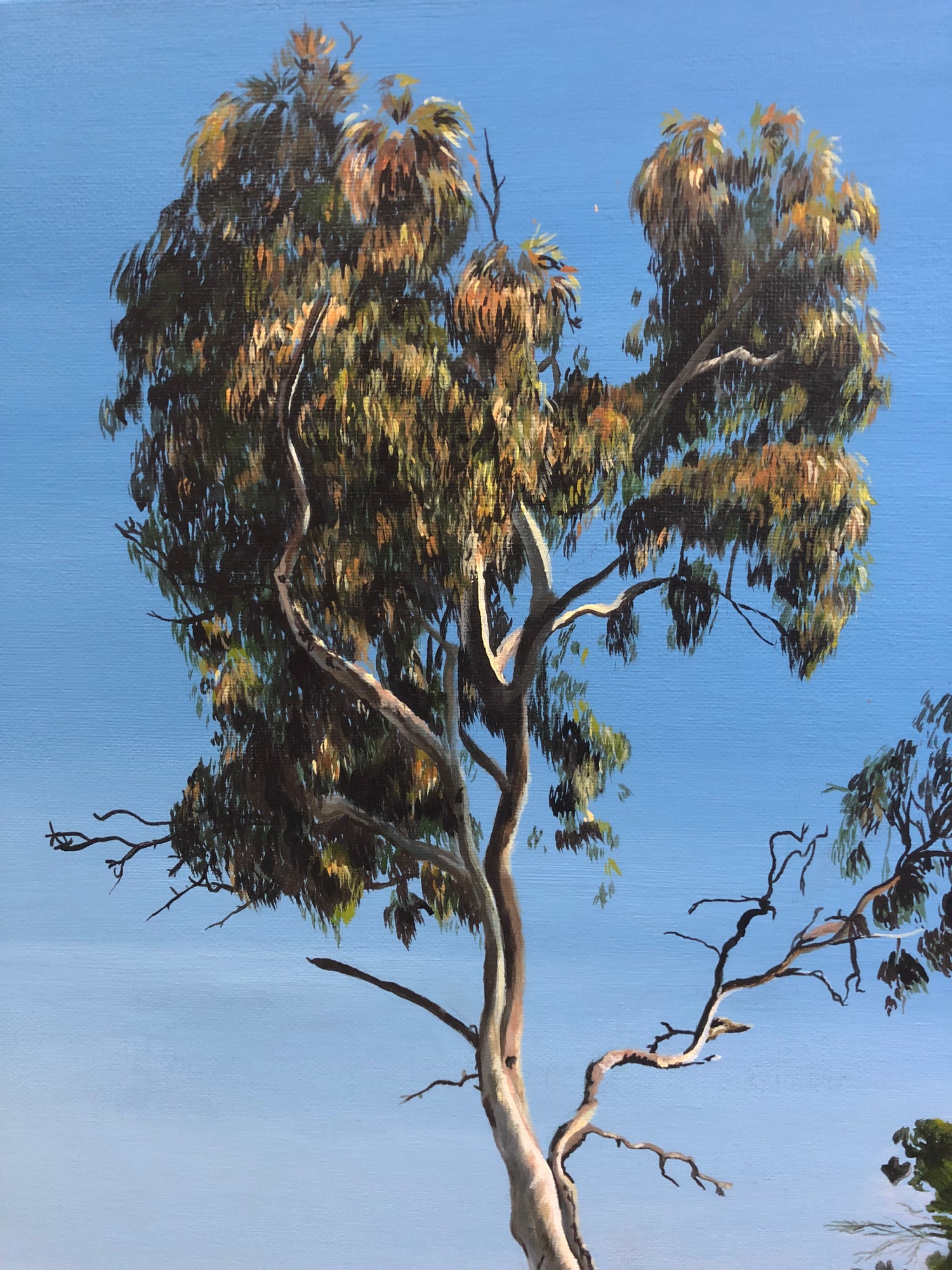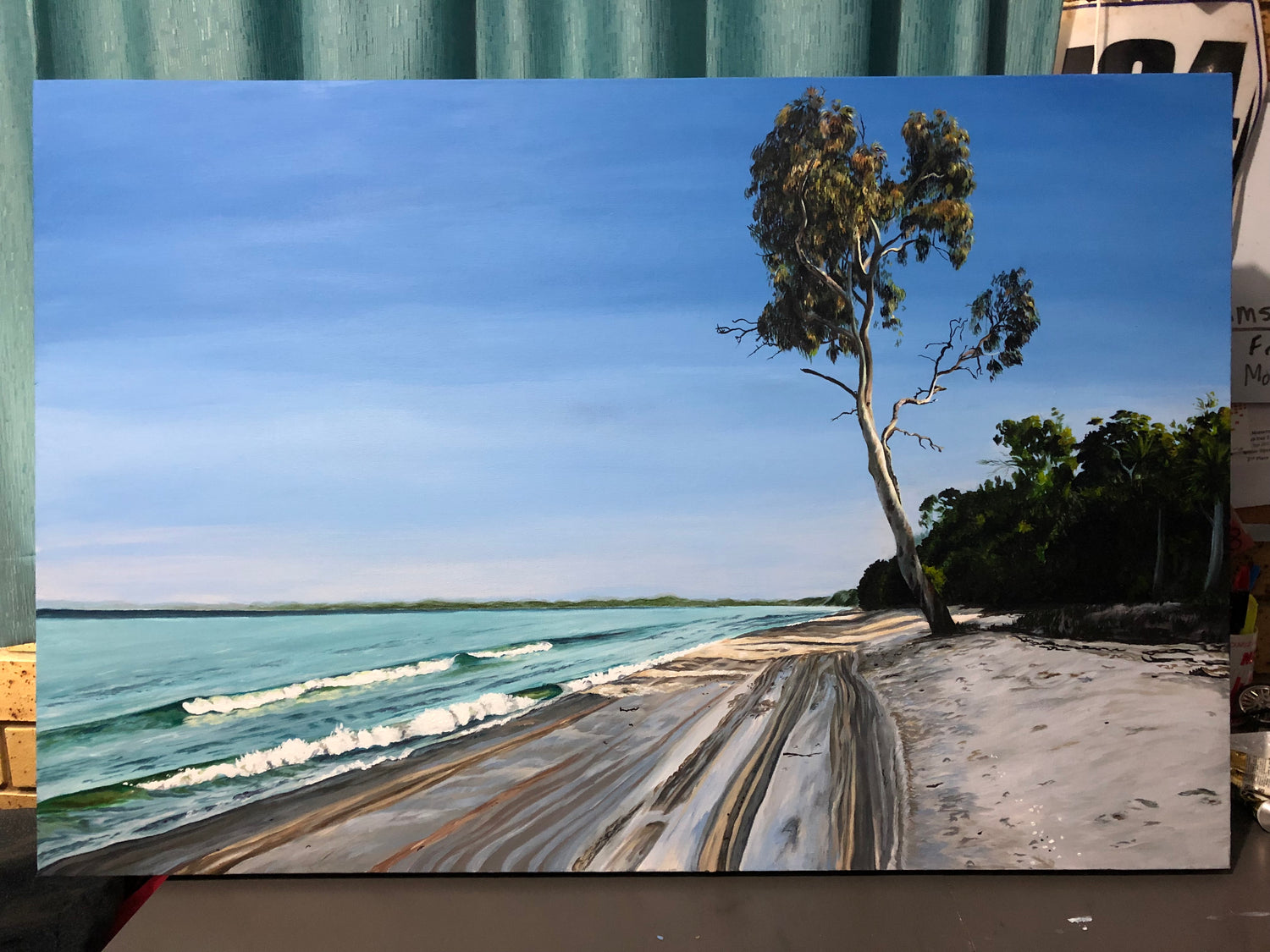 With sand banks that stretch over 120km, vast dunes and deserted beaches, it's hard not to feel at peace as you enjoy a drive along the coast line of K'gari (Fraser Island). Travelling down the western coast lies one tree that stands out from the rest. It has planted its roots on the high tide line, growing tall and strong above the cascading waves and fading tire tracks of passerbyers. The simplicity and serenity of this scene is what inspired this painting. I wanted to capture the perspective of the sand banks with the tire tracks fading into the distance. People come and go and enjoy what Fraser Island has to offer, but everyday the morning sun will kiss the branches of this big, old tree.Acrylic on canvas