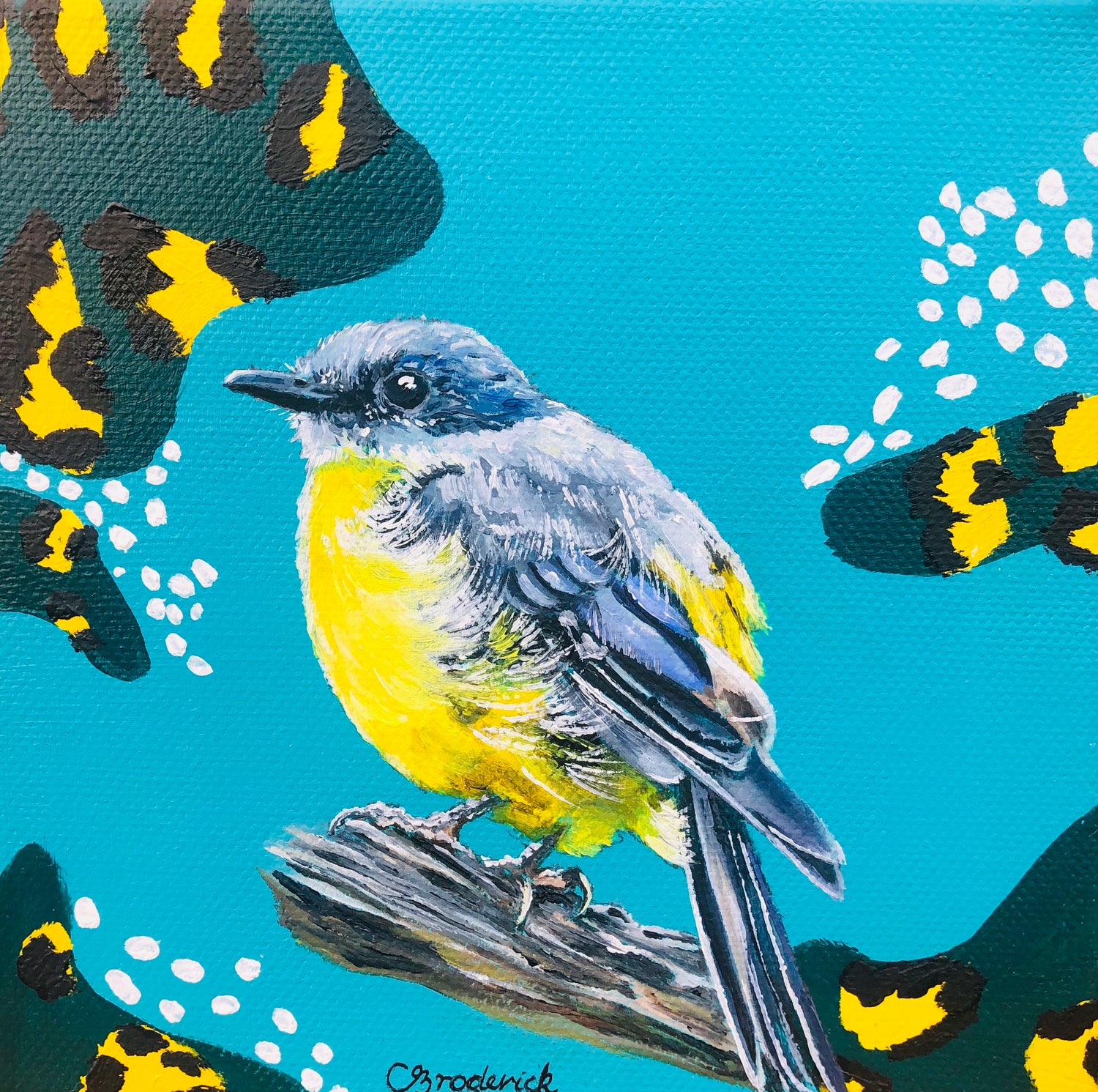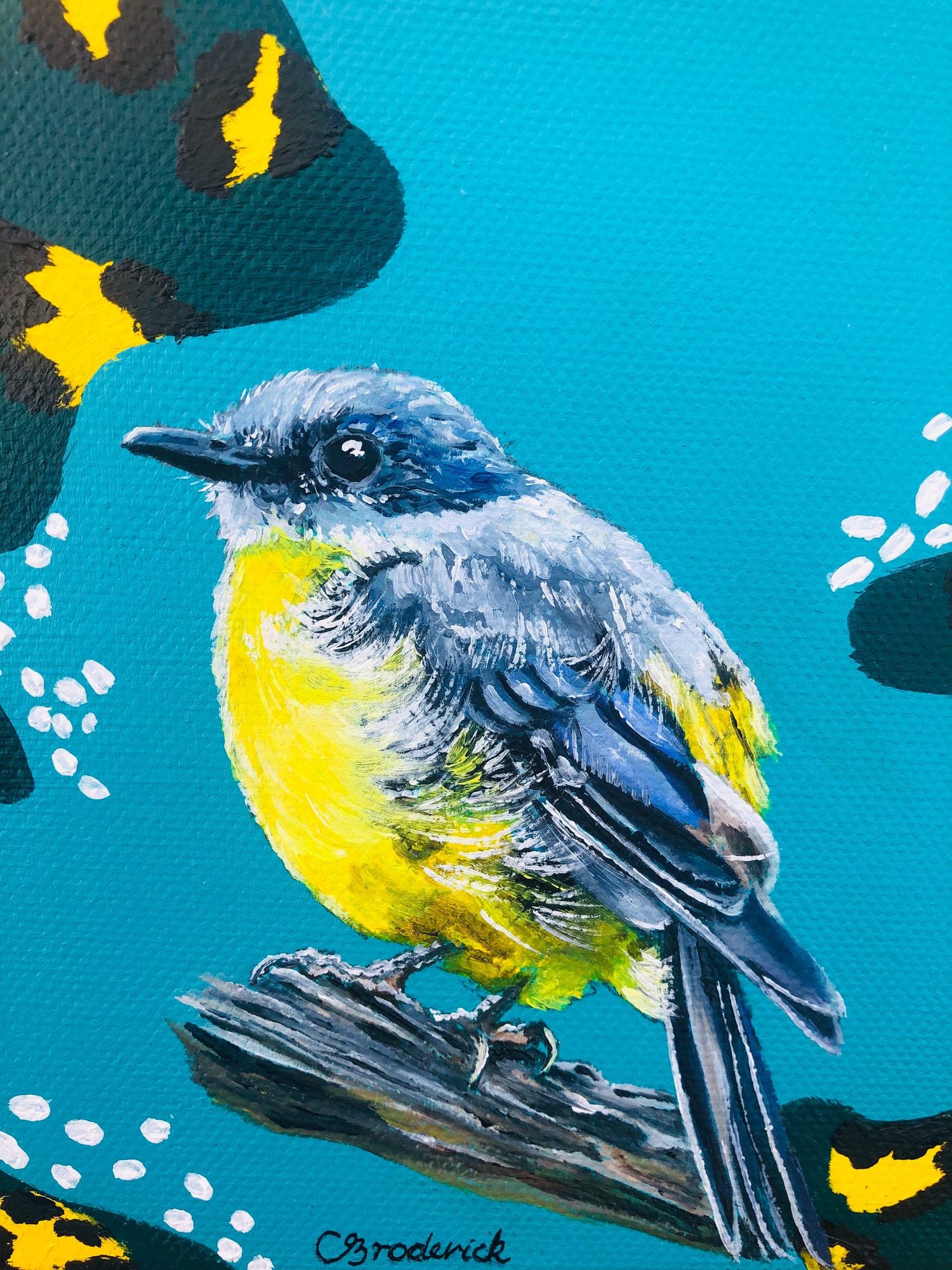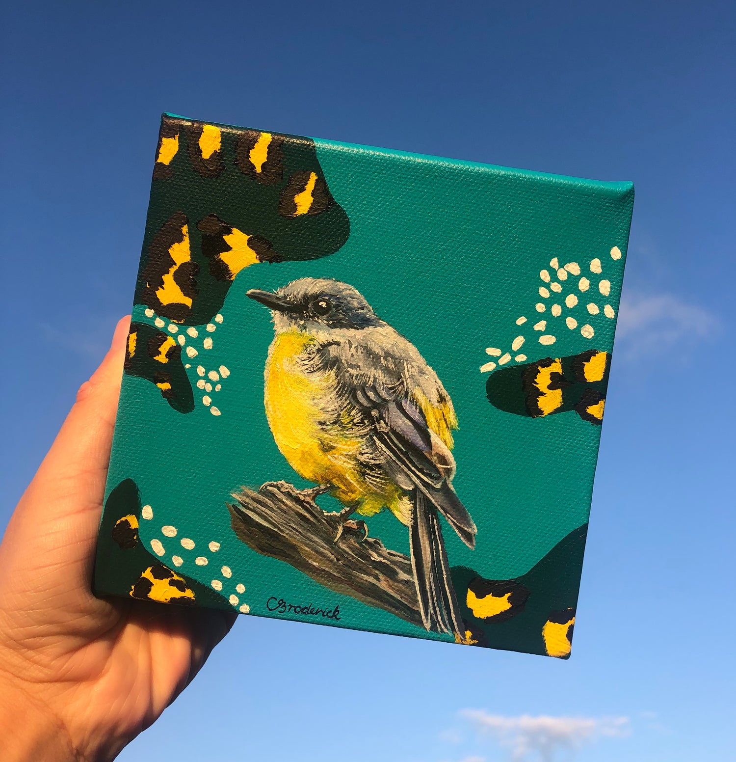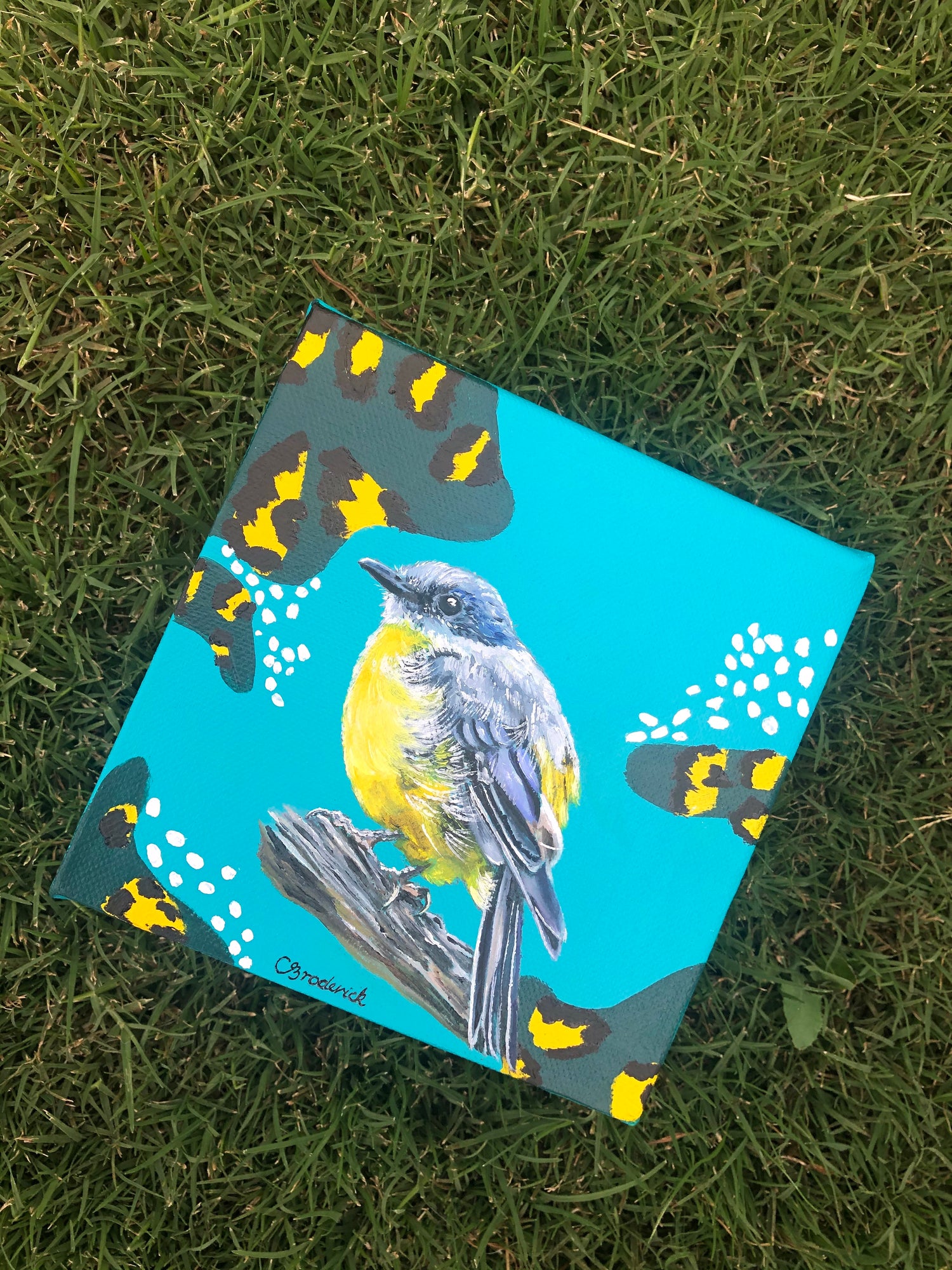 This artwork is inspired by a bottle of wine and a cute bird! Loving pops of colour to bring a hint of abstract painting into my realistic work.