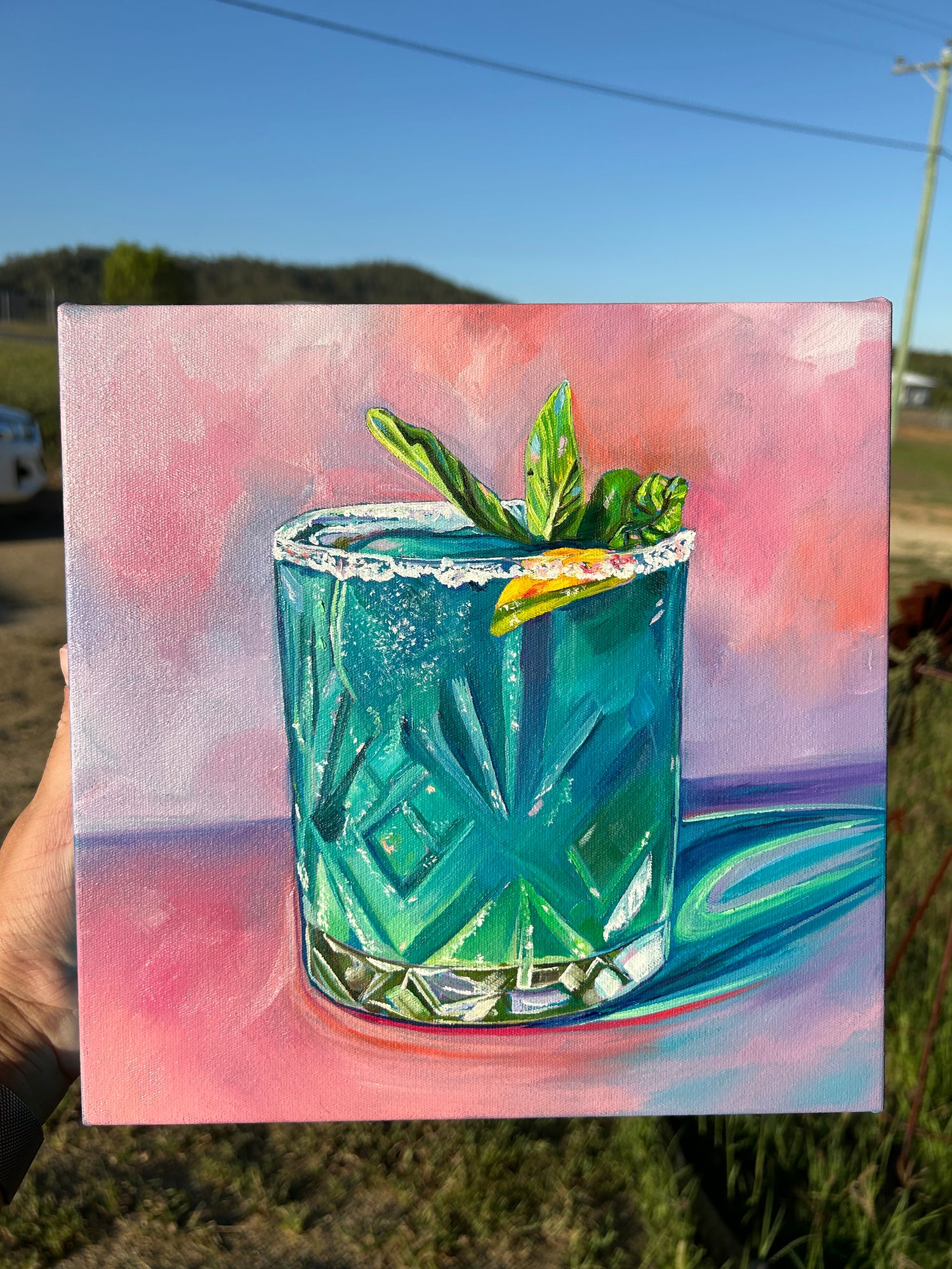 Tequila, Cointreau, aperol, coconut milk, lime juice. This one will bring in the spunk! Bright colours, broad strokes and delicious textures, this mini cocktail piece is a true statement. Perfect for that shelf, hall table, kitchen cupboard or awkward space that is in need of some brightening up. 25cmx25cm with frame 28cmx28cm