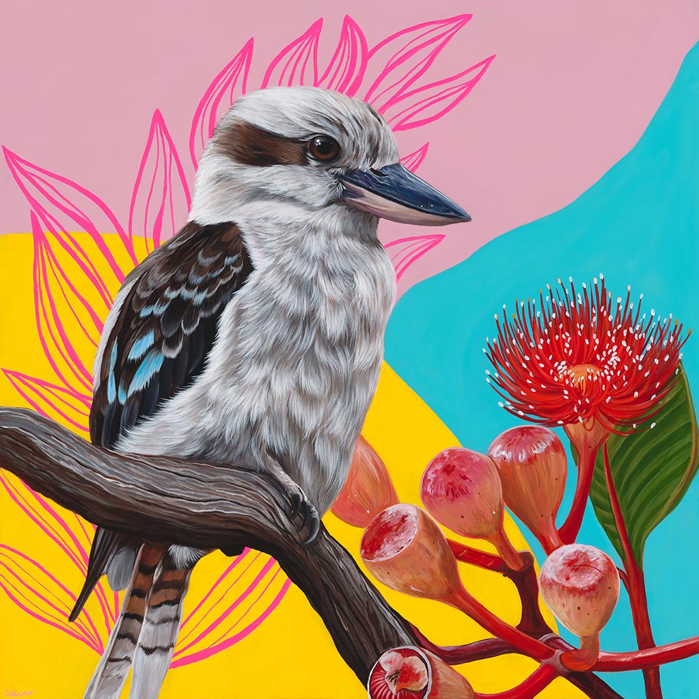 This striking artwork features a beloved Australian kookaburra, captured in a moment of calm against a backdrop of bold, joyful colour. Surrounded by vibrant native blooms and playful line work, the piece balances realism with imagination, celebrating the character and quiet confidence of this iconic bird.