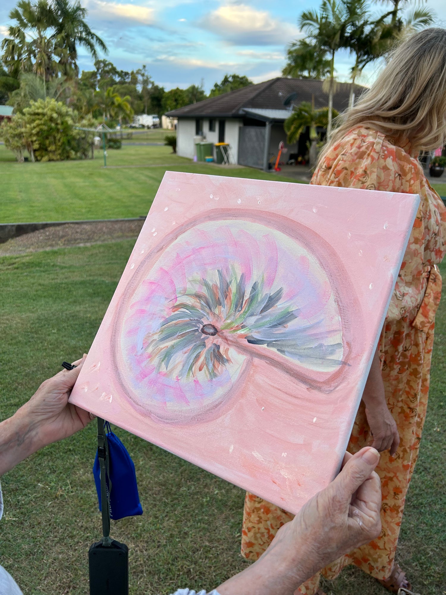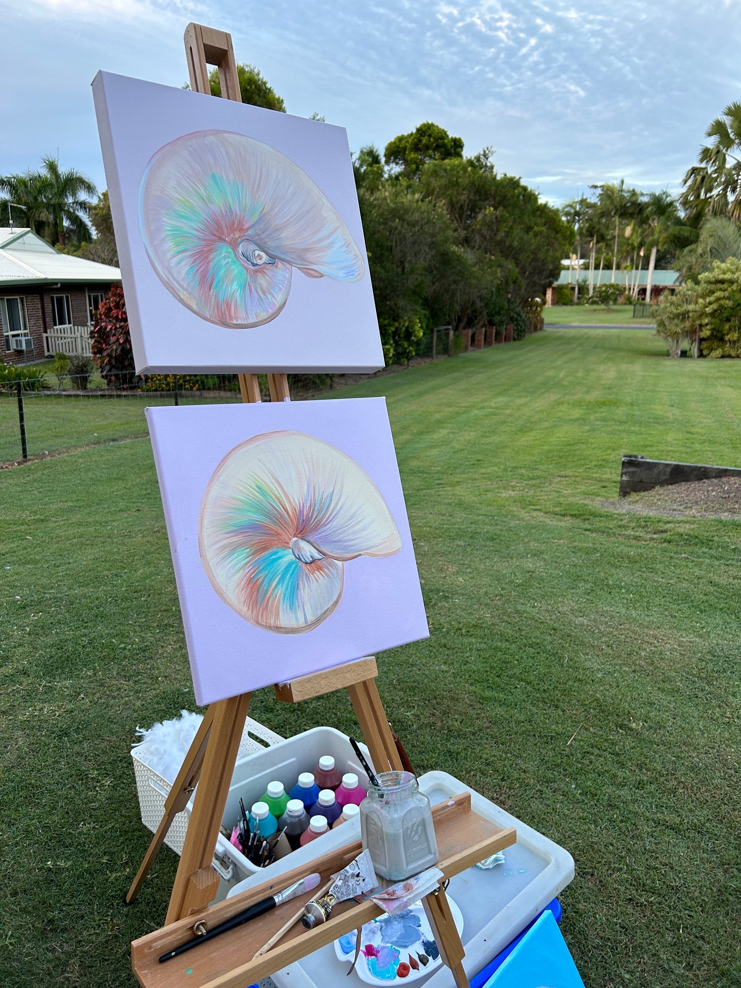 In this particular workshop, we learn how to paint a colourful, iridescent nautilus shell! Have fun playing with colours and texture in this relaxed, beach style workshop!