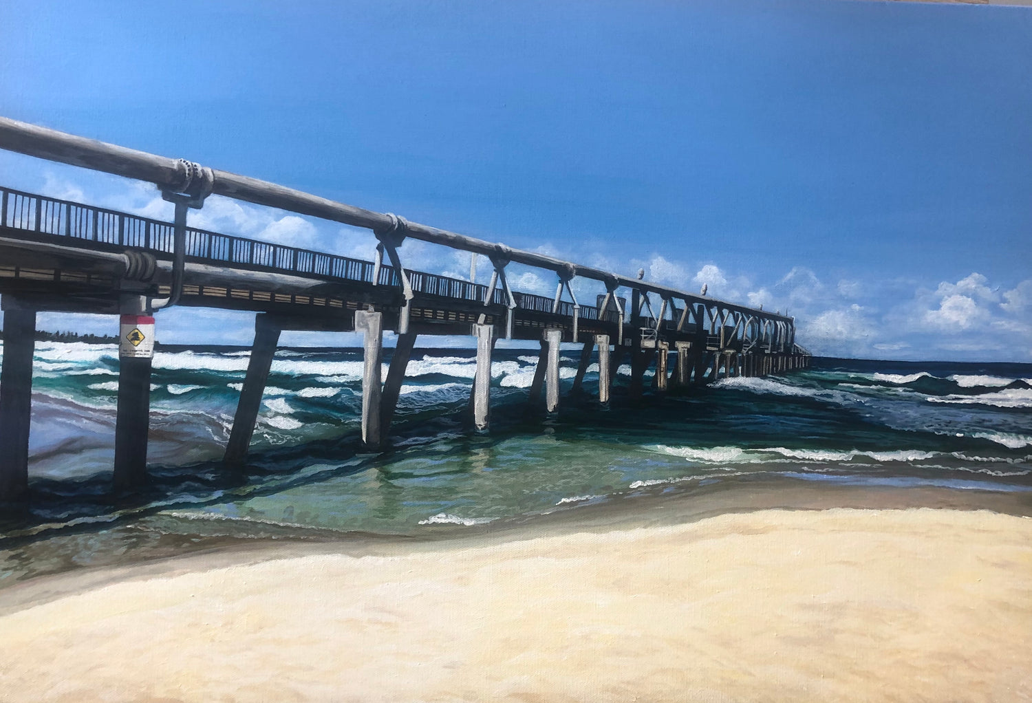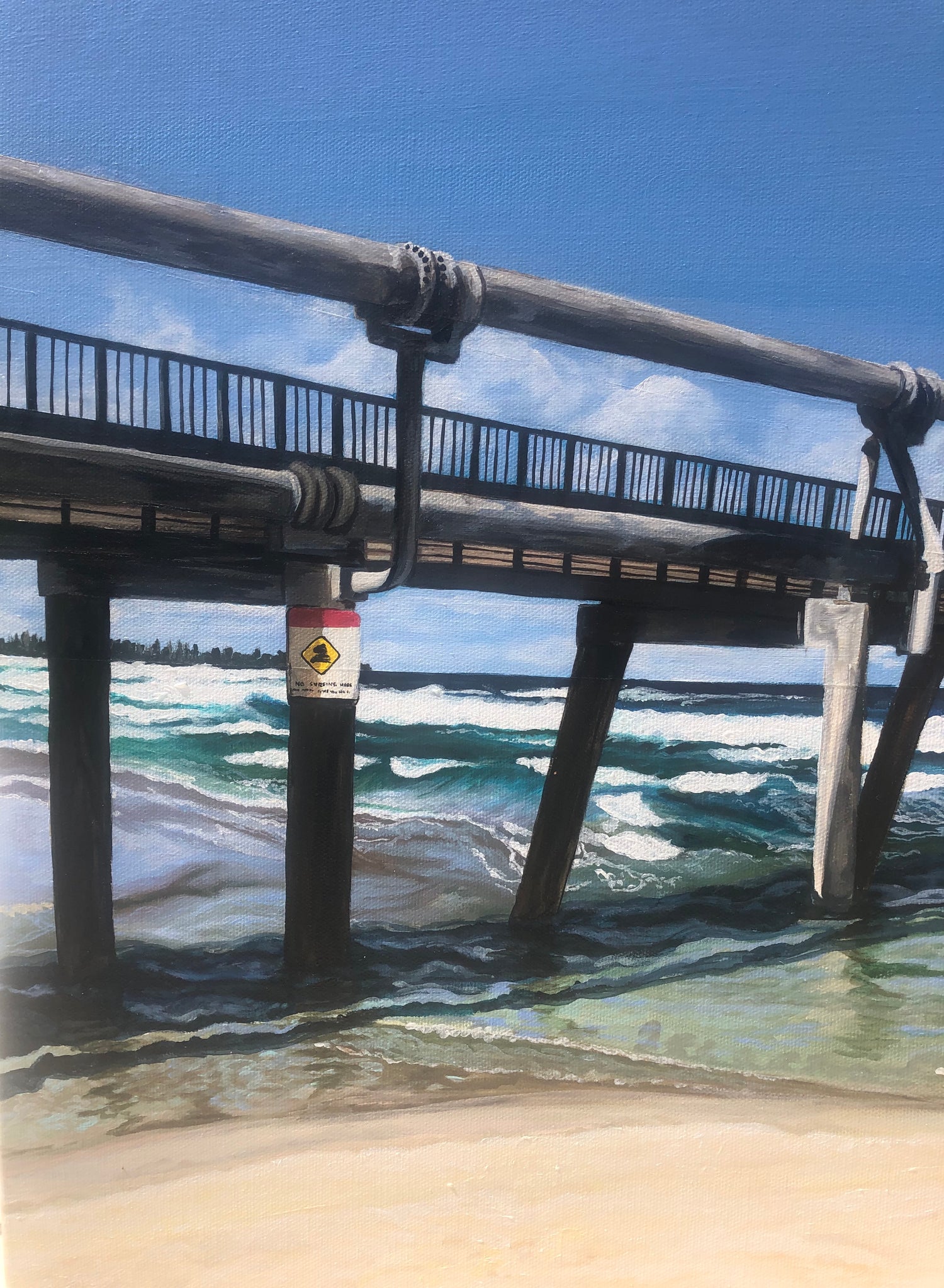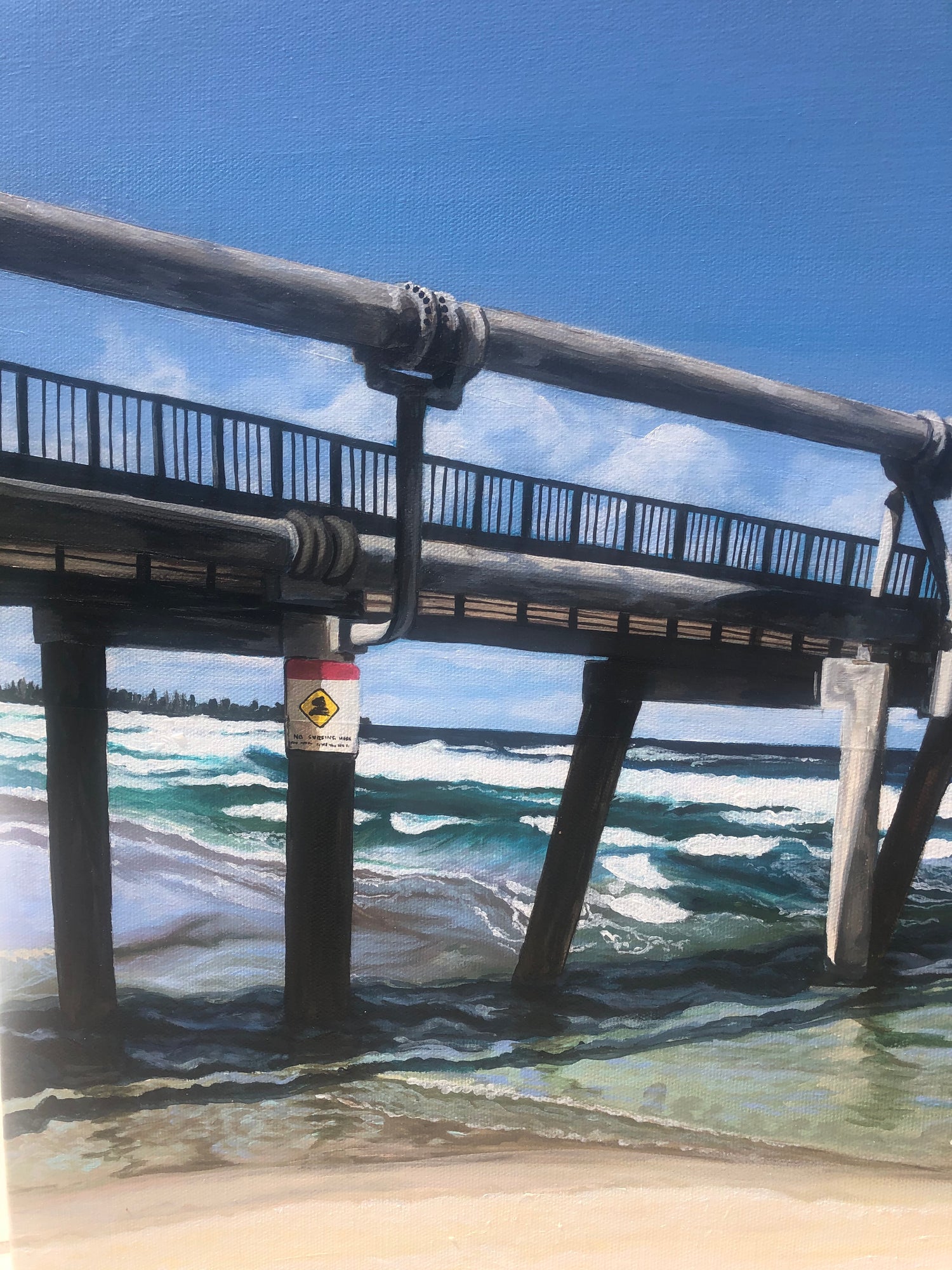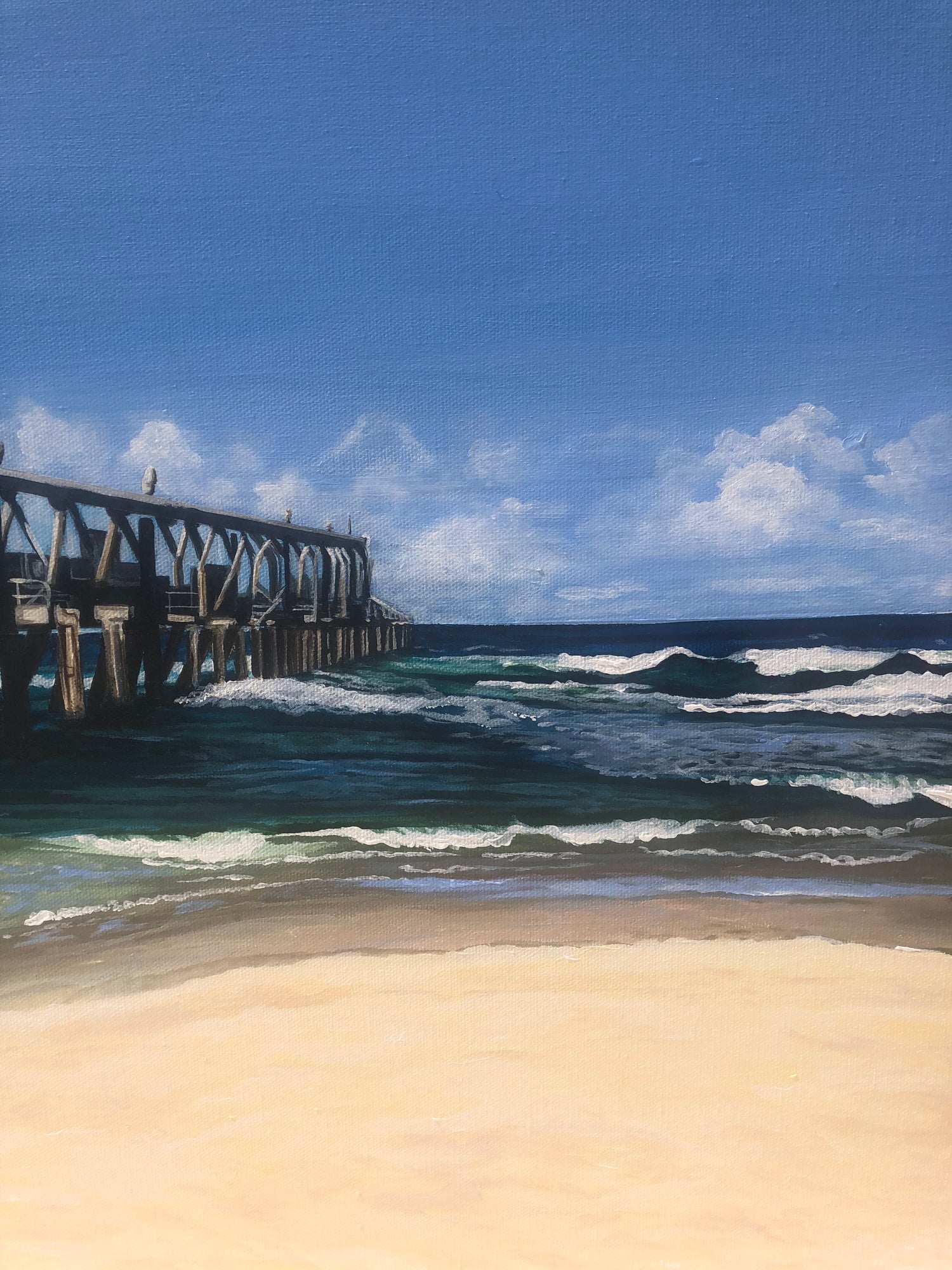 I started this painting long before we were restricted by the lockdown from Corona Virus. I hadn't worked on it since November 2019 (back when we were free). I was motivated to paint it again as I was longing to walk along this beach, knowing that I could not travel the 8 hours south to visit my family. Inspired by the pier and dog beach at South Port, Queensland