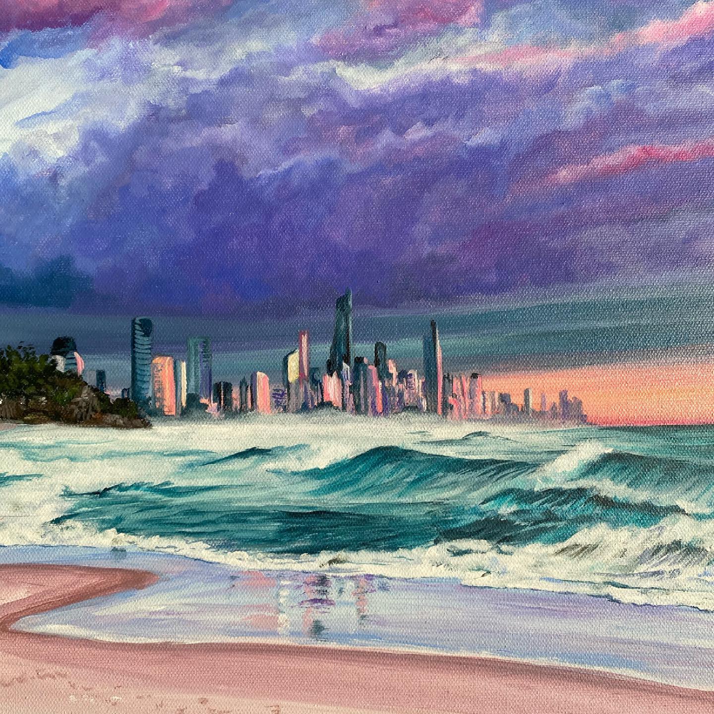 This painting was inspired by a moody day at Surfer's Paradise, where a storm was closing in just as the world was seeing first light. Beautifully moody.