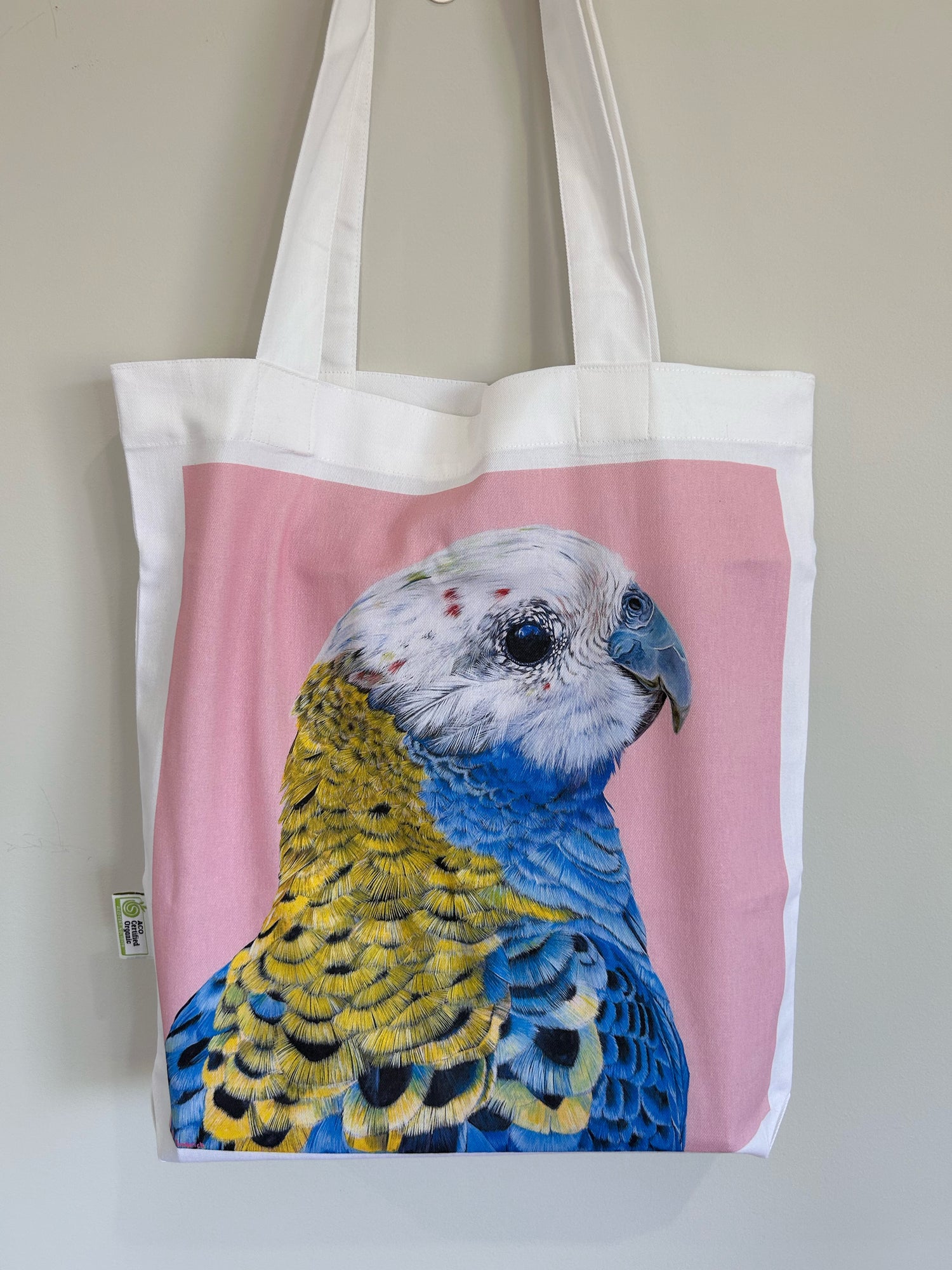 Rose is a pale-head rosella. She’s beautiful and feminine with her soft pastel shades of blues and yellows against a pink background. This beautiful tote bag is made from 100% certified organic cotton and printed locally in Australia.